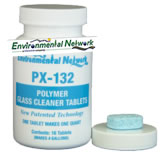El limpiador de vidrios de polímero PX-132 en tabletas ofrece una nueva tecnología patentada de productos efervescentes que permite al usuario mezclar un producto de limpieza de vidrios de primera calidad ahorrándose el uso de máquinas dispensadoras, un complicado envasado de porciones o productos costosos. Un frasco de 16 tabletas le proporcionará hasta 15.1 Lts. (4 galones) de limpiacristales listo para usar. PX-132 no contiene alcohol ni amoníaco y puede utilizase en la limpieza de cristales o limpieza delicada de cualquier superficie resistente al agua.